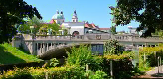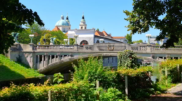 Seguimos em direção à Praça do Congresso, cujos pontos principais são o Parque Zvezda, um espaço verde com caminhos em forma de estrela que se irradiam a partir de um ponto central, a Igreja Ursulina da Santíssima Trindade, conhecida pelo seu altar de mármore e o edifício majestoso que abriga a sede da Universidade de Liubliana.