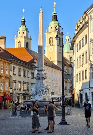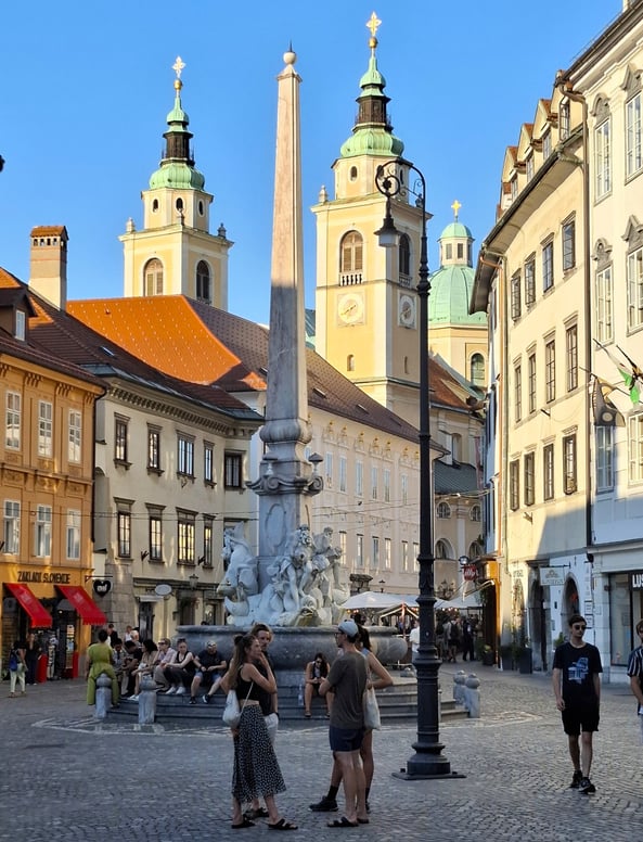 Iniciámos o segundo dia pela Ponte Tripla, que consiste na conexão de três pontes que atravessam o Rio Ljubljanica, localizada na Praça Prešeren, a principal praça de Liubliana, próxima a importantes pontos turísticos como a Estátua de France Prešeren, o autor do Hino Nacional Esloveno e a Igreja Franciscana da Anunciação, que se destaca pela sua fachada barroca pintada de rosa. Uma das ruas do centro histórico levou-nos a outra praça emblemática, a Praça Mestni, onde se localiza a Câmara Municipal de Liubliana e a Fonte de Robba, que representa os três rios principais da região histórica da Carníola: o Ljubljanica, o Sava e o Krka. Seguimos pela Stari Trg, que significa Praça Velha, apesar do seu nome, é mais uma rua do que praça, que serpenteia ao longo da base da colina do castelo e mantém o charme da época medieval, com edifícios históricos e uma atmosfera pitoresca. A Stari trg conecta-se diretamente a outra rua histórica, a Gornji Trg, reconhecida por um ambiente mais calmo, oferecendo os melhores restaurantes da cidade e onde destacamos a Igreja de São Floriano, localizada no final da rua.