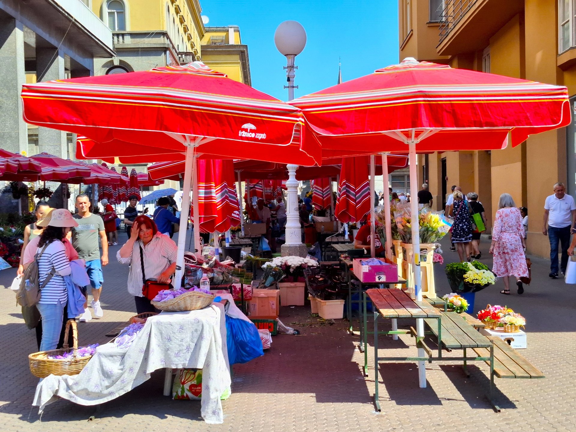 Bem cedo rumámos ao Mercado Dolac (Tržnica Dolac), conhecido pelo seu ambiente animado e autenticidade cultural. A área ao ar livre é reconhecida pelos seus chapéus de sol vermelhos, que cobrem as bancas, e aqui, os vendedores locais vendem produtos que vêm diretamente dos seus terrenos. Já na área coberta pode-se comprar uma grande diversidade de produtos alimentares e existem pequenas lojas de artigos como especiarias, frutos secos e artesanato local.