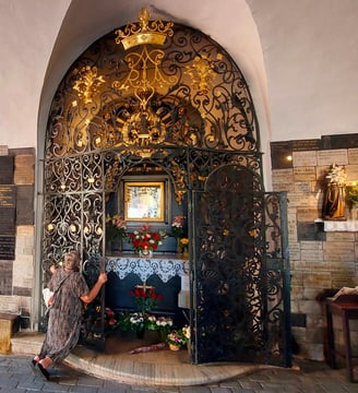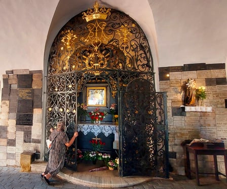 Chegámos ao Portão de Pedra (Kamenita Vrata), um dos monumentos históricos mais significativos e uma das principais atrações da Cidade Alta. Durante um grande incêndio este portão ficou severamente danificado, no entanto, uma pintura da Virgem Maria com o Menino Jesus permaneceu intacta. Após este acontecimento, a pintura passou a ser venerada como milagrosa, e foi construída uma capela dentro do portão para abrigá-la.